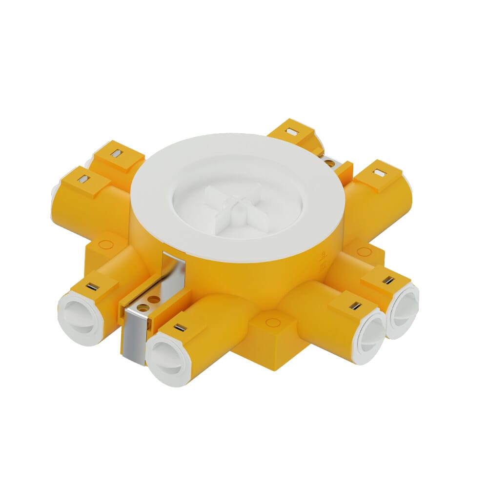 Superenkelt byggesystem. Stusser og stenderfeste demonteres fra boksen ved å trekke stussen noe ut i øvre kant. Når låsetaggen er synlig vris stussen eller stenderfeste mot klokken og stussen er løs. Verktøy skal ikke brukes på stusser eller stenderfester. Når stussen er tatt av kan skjøtestuss monteres ved å sette skjøtestykke i stusshullet og dreies med klokken 45 grader (tang kan med fordel brukes).