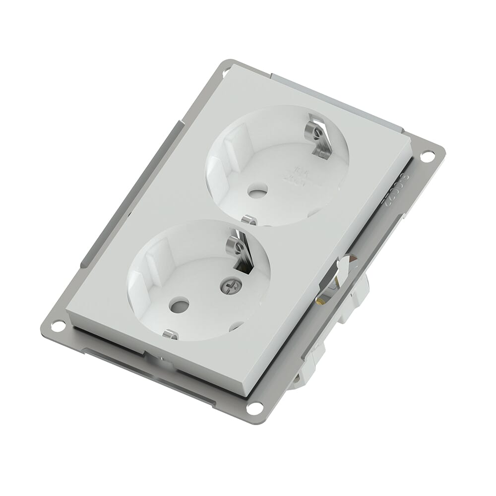 Lavtbyggende innfelt polarhvit dobbel stikkontakt u/ ramme 16A m/ jord og barnevern.