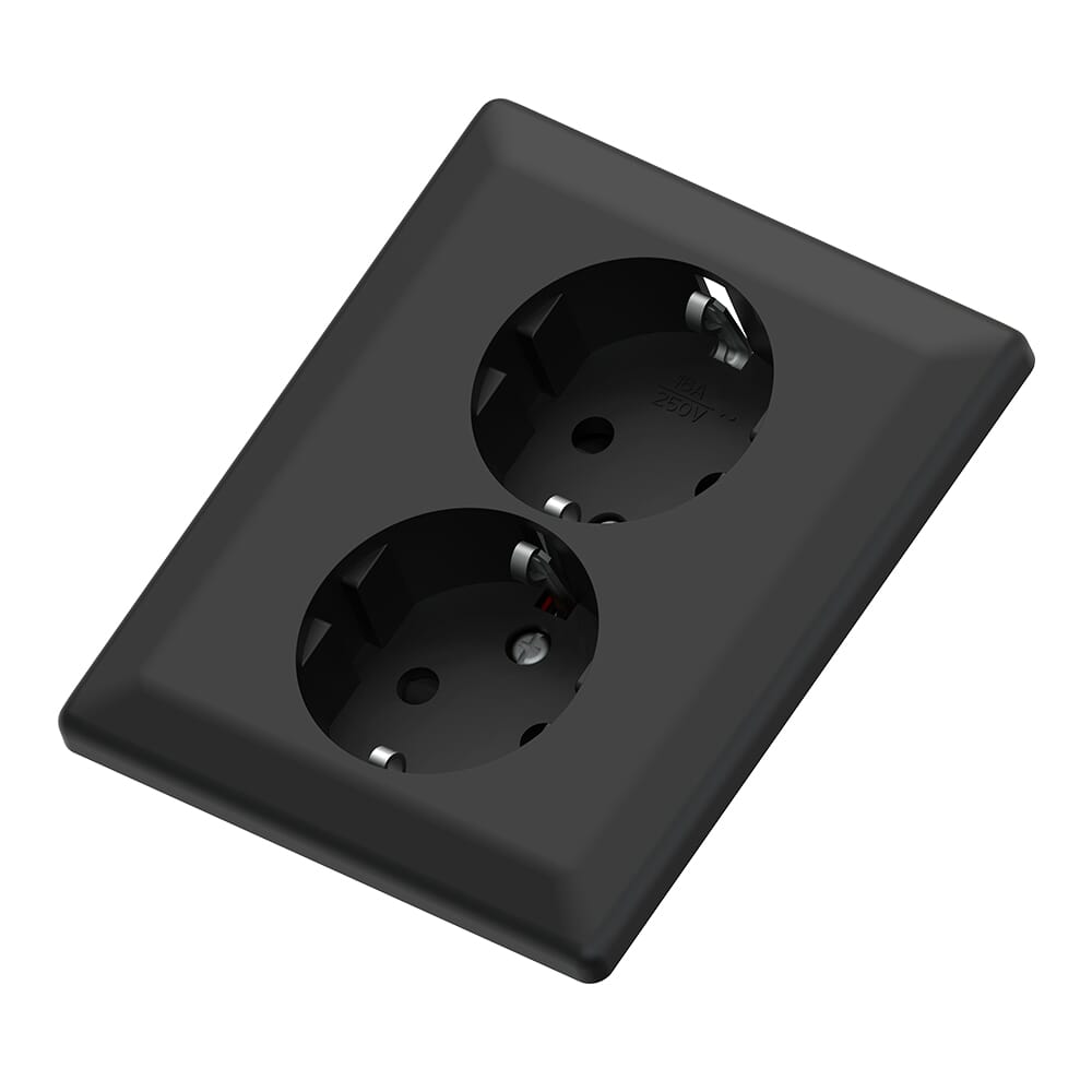 Lavtbyggende innfelt sort dobbel stikkontakt 16A m/ jord og barnevern